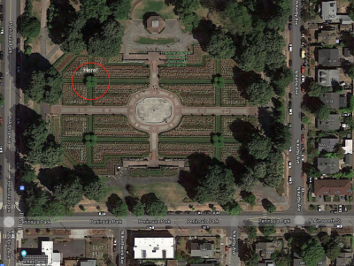The red circle marks the clump of trees where the musicians gather. Shady!